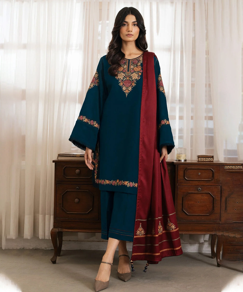 Dhanak-3PC Embroidered Shirt with Digital Printed Wool Shawl - 3495